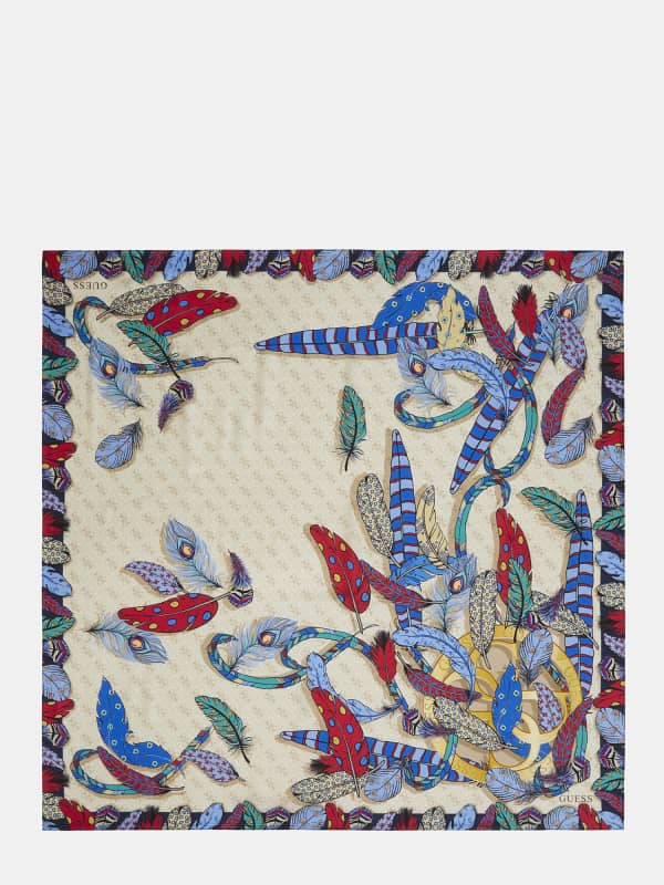 İpek karışımlı fular.4G logolu yaprak ve tüy baskılı.Ölçüler: 90x90 cm.ANA KUMAŞ BİLEŞİMİ: %54 Modal, %27 Viskon, %19 İpek.Elde yıkama.