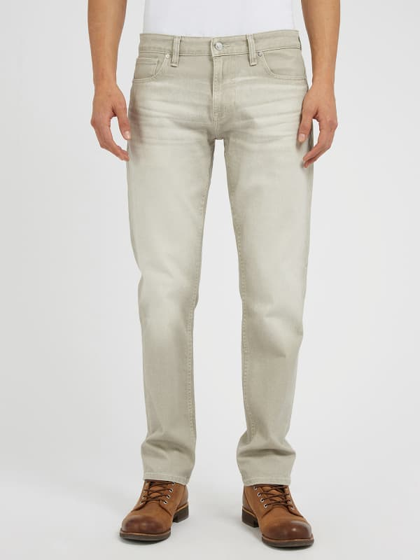 Yaşanmış bir görünüme sahip renkli, düz jean pantolon, düşük bel kesimi, hafif bıyık ve solmaya sahiptir.