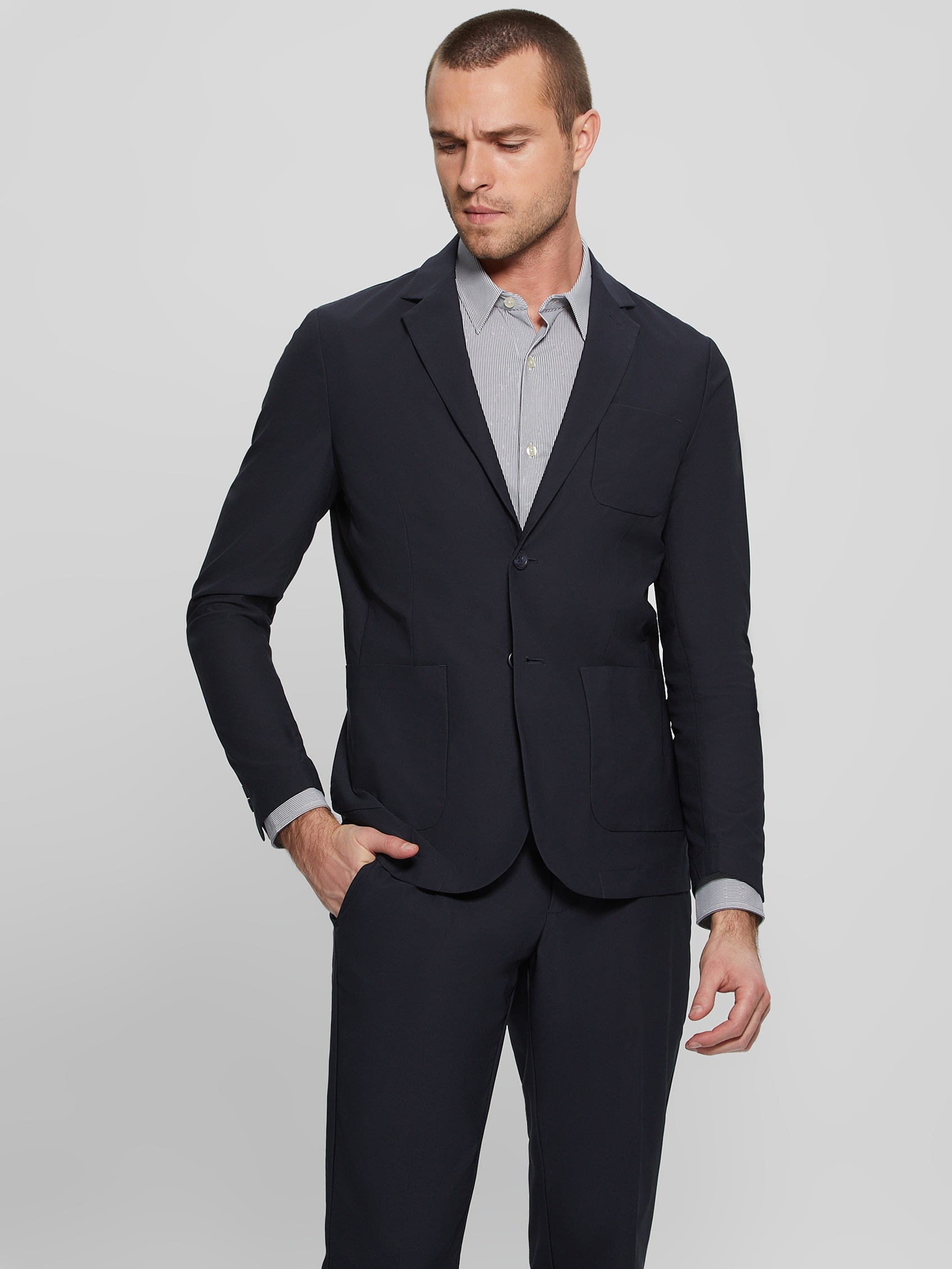 Tech-stretch dimi blazer Çentikli yaka Düğme manşetli uzun kollu Slip cepli Arka havalandırma Astarsız Çift düğmeli kapama Dokuma %61 Elastomultiester, %39 Polyester.