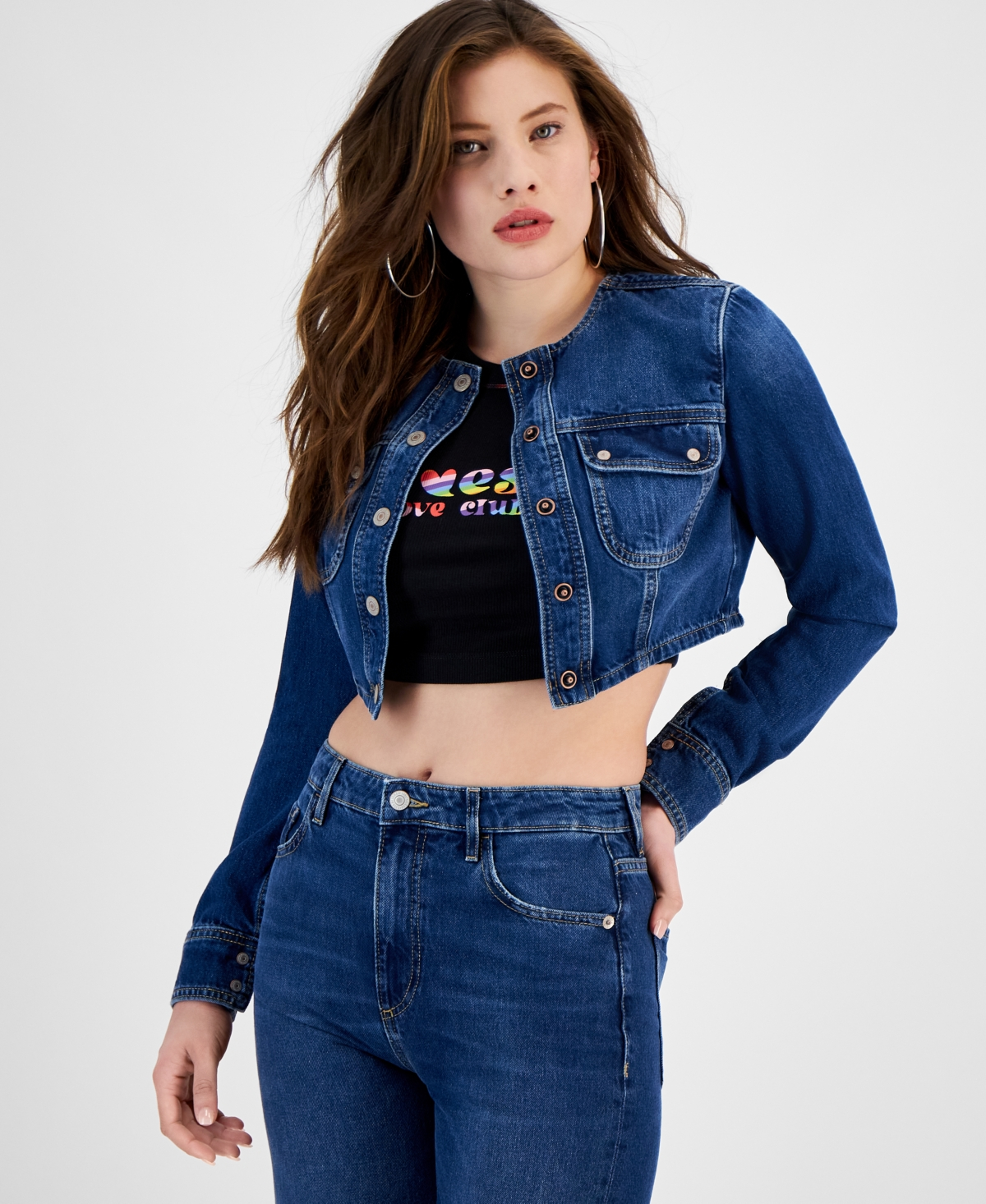 Payetli logo grafiği, Guess'in bu şık kırpılmış denim ceketinin arkasına ışıltı ve parlaklık getiriyor. Kadın Kadın Giyim - Ceketler.