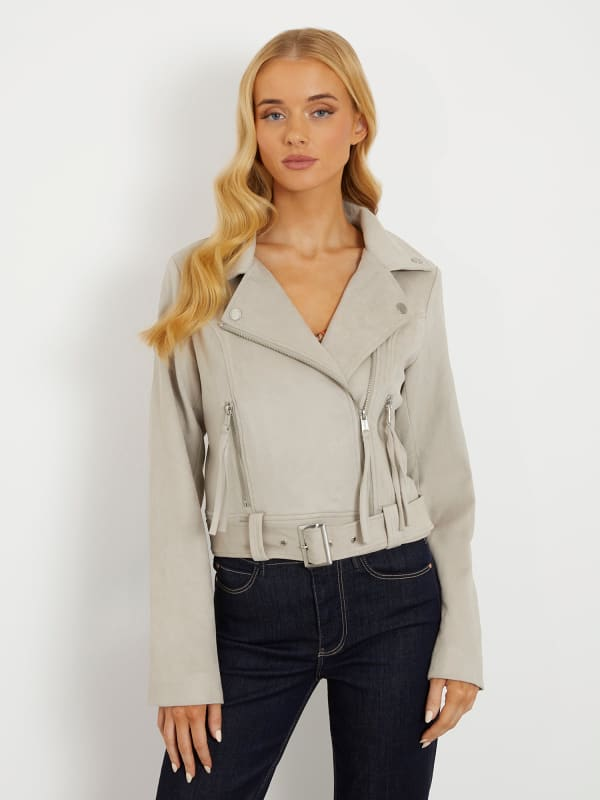 Suni süet ceket.Biker yaka.Uzun kollu.Dar kesim.Fermuarlı.KUMAŞ TİPİ: Suni süet.SÜSLEMELER: Kemer ve fermuarlı.Yan cepler. Resim S bedeni göstermektedir Toplam uzunluk: 48,5 cm / 19.09 inç Kol uzunluğu: 64,5 cm / 25.39 inç Bedene tam oturur.