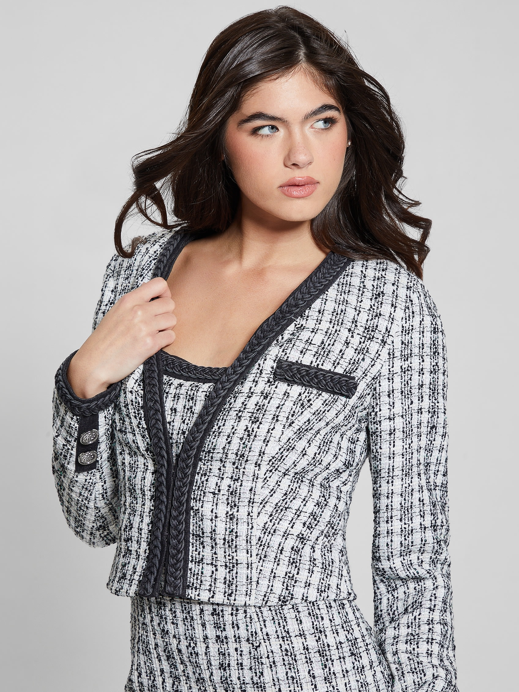 Dokuma tüvit ceket V yaka İmza şakayık düğme desenli uzun kollu Örgü detaylı kontrast süslemeli Yapılandırılmış omuz pedleri Saten karışımlı astar Çift göğüs cebi Kanca ve göz kapakları %100 Geri Dönüştürülmüş Polyester. Geri dönüştürülmüş plastik içerir.